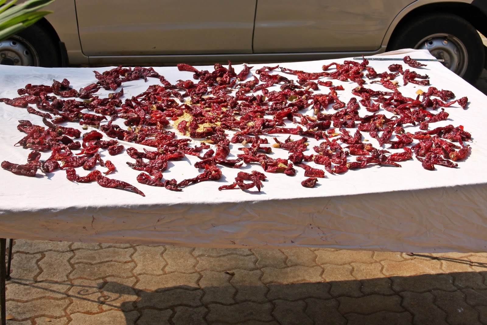 Cocos, para secarem (e mais tarde extrair-se o óleo), piri-piri vermelho e peixe. Produtos que é costume ver-se a apanhar banhos de sol nos quintais das casas em Goa. Vêem-se também chouriços, feijões e arroz. Vou ficar atenta aos quintais e alpendres sol para ver que outros produtos andam a apanhar escaldões.