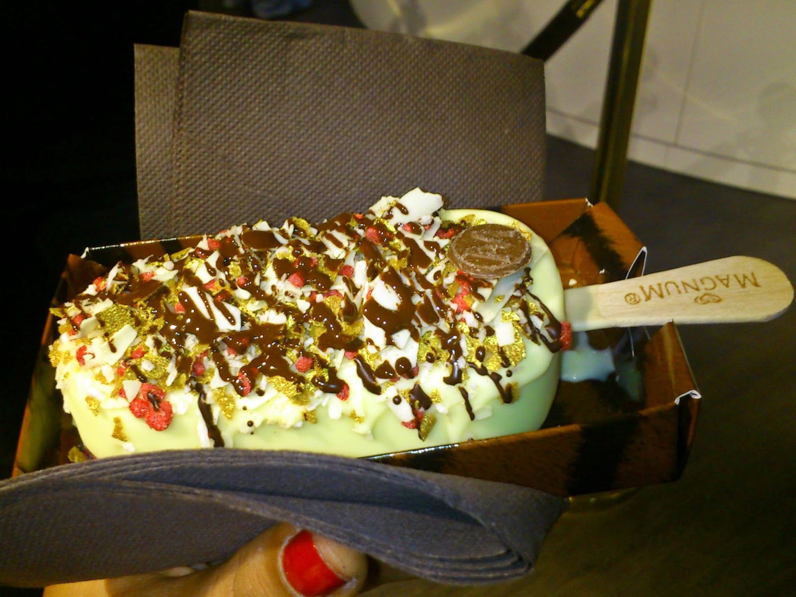 Ir à Magnum Pleasure Store é daquelas coisas que tem de se fazer uma vez na vida em Lisboa. Primeiro enfrenta-se a fila interminável. Depois o calor da loja em si. Depois a simpatia dos funcionários. Se tivermos sorte. Já ouvi pessoas queixarem-se. Depois o preço. 3€ não é simpático, mas vá, é uma experiência. Depois a indecisão. Escolhe-se o chocolate (branco, chocolate ou negro) e três condimentos (eu escolhi coco ralado, raspas de chocolate branco, rosa cristalizada e flocos dourados porque o funcionário foi generoso ou distraído), depois o tipo de chocolate para o toque final e depois aguarda-se que a mistura solidifique. Ei-lo: